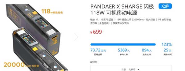 前不久,魅族在有点东西秋季发布会上,带来超过 30 款新品,而 PANDAER 也作为魅族的一个 " 个性化配件 " 的品牌,首次走到大众面前。其中,PANDAER x SHARGE 闪极 118W 可视移动电源以达成众筹目标,众筹人数超过 5000 人,众筹售价为 699 元,而最终零售价为 999 元。
