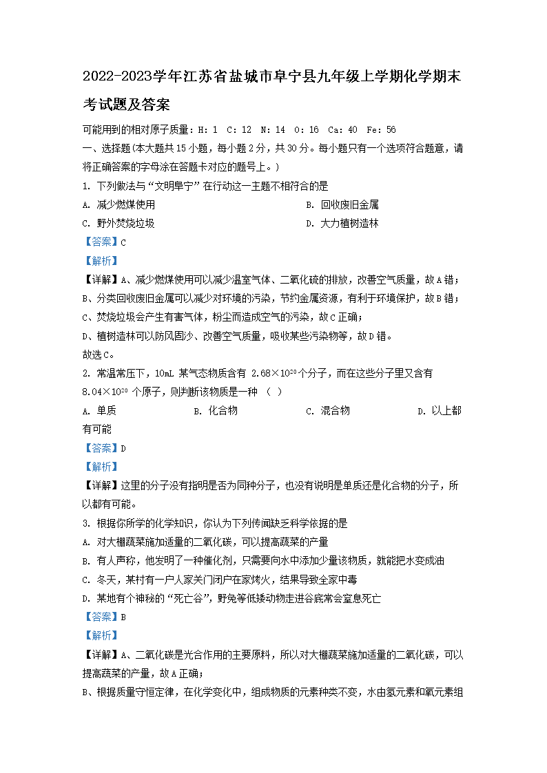 2022-2023学年江苏省盐城市阜宁县九年级上学期化学期末考试题及答案(Word版)09-22