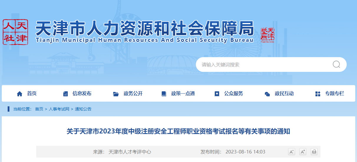【#安全师考试# 导语】®文档大全网从天津市人力资源和社会保障局获悉,《2023年天津中级注册安全工程师职业资格考试考务工作通知》现已公布,®文档大全网从公告中了解到,符合条件的考生可在8月22日-31日进行网上报名,2023年天津中级安全工程师报考条件如下: