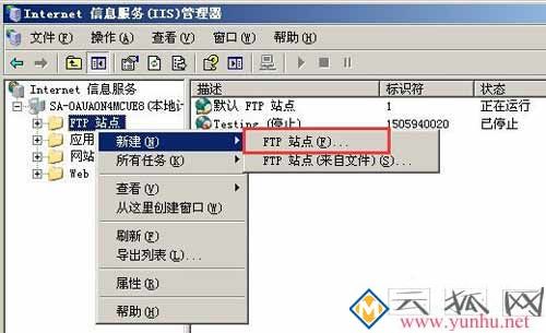 3、选中FTP站点,点击右键,选择新建,点击FTP站点(F)。