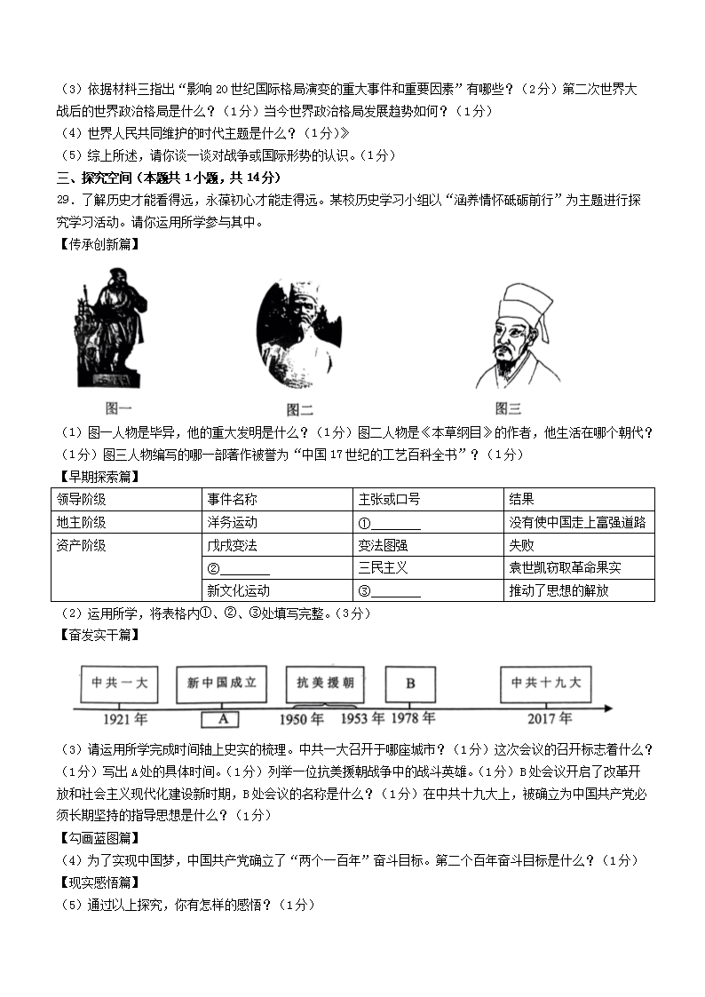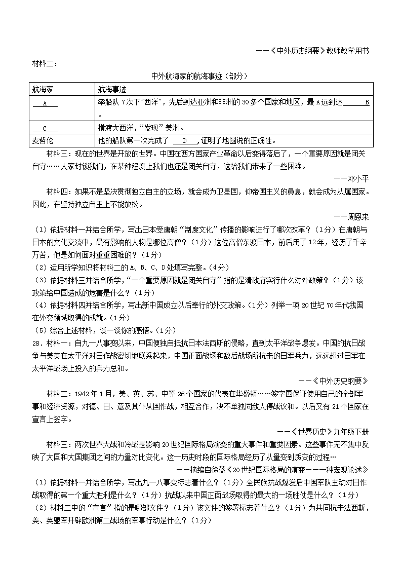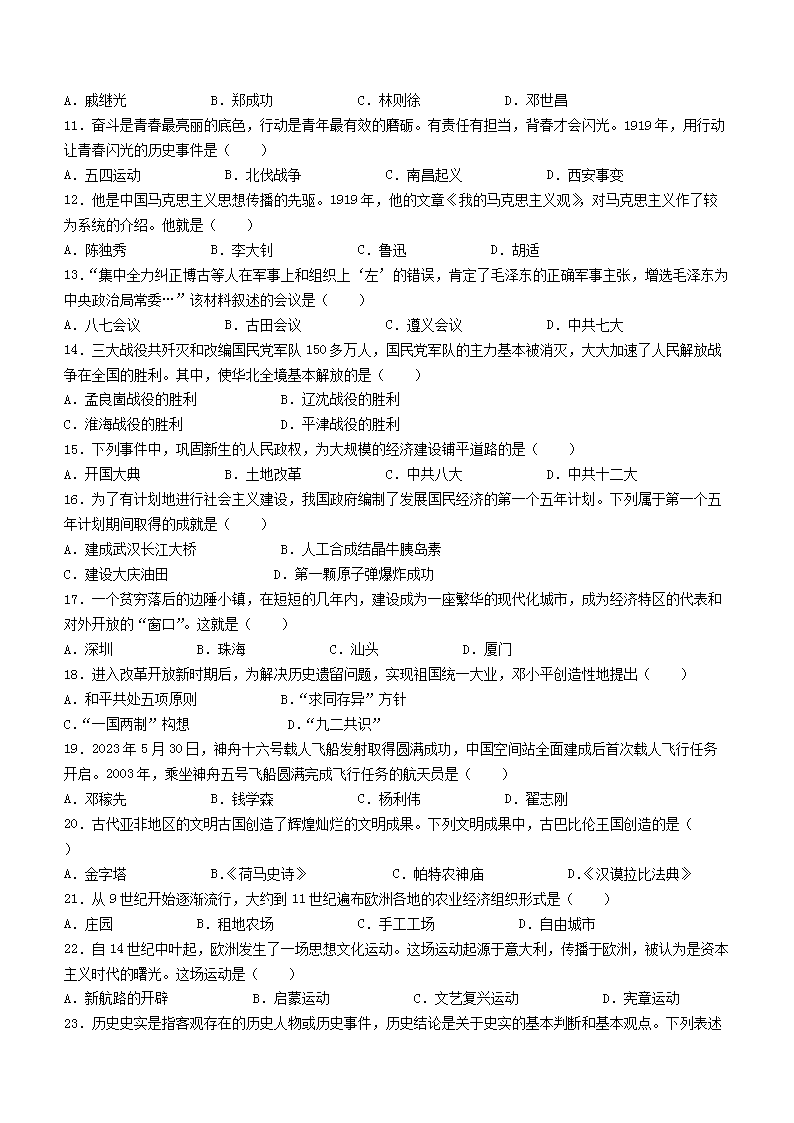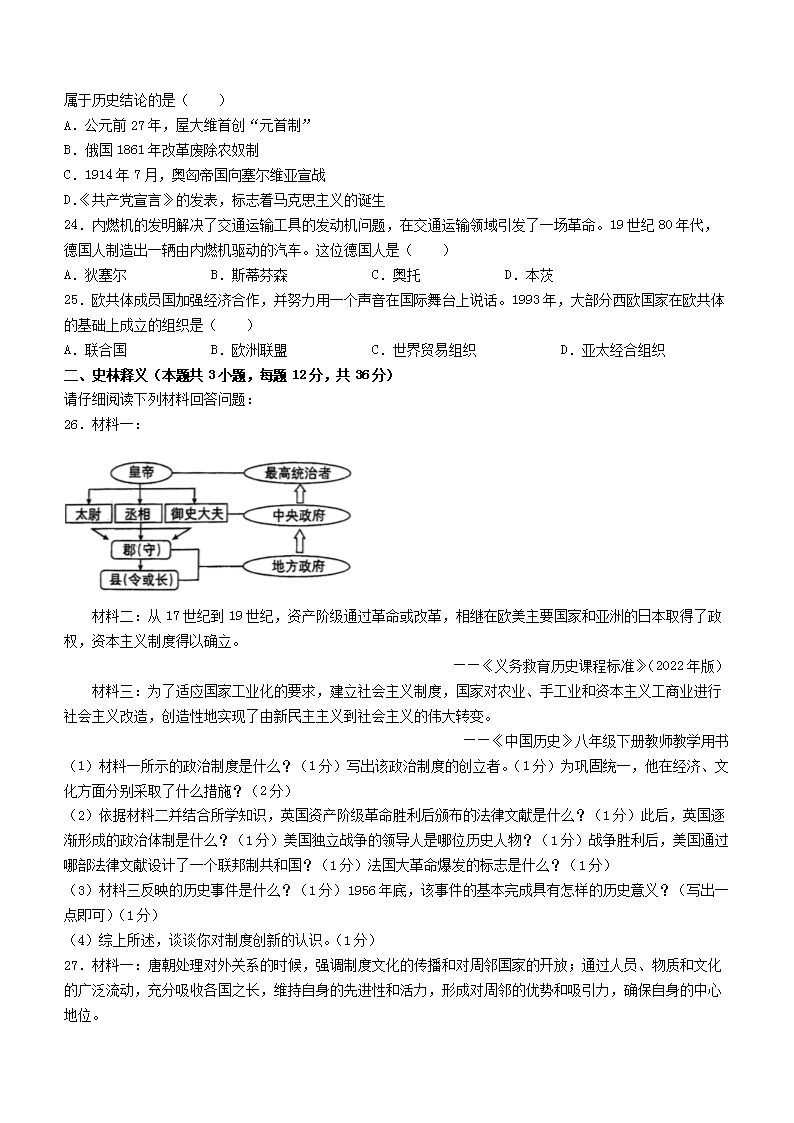 2023年黑龙江齐齐哈尔中考历史真题及答案(Word版)06-30