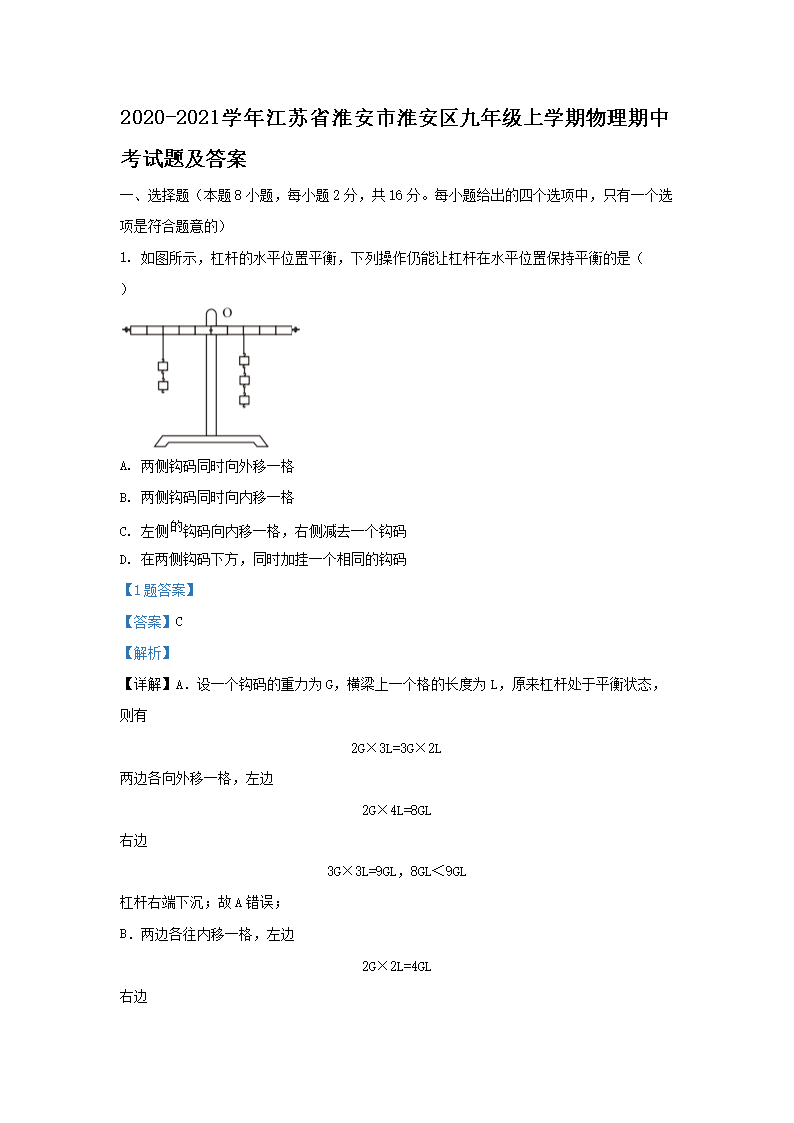 2020-2021学年江苏省淮安市淮安区九年级上学期物理期中考试题及答案(Word版)10-09
