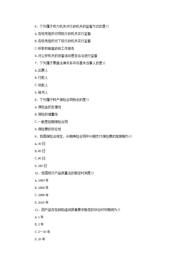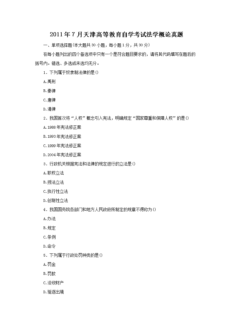 2011年7月天津高等教育自学考试法学概论真题(Word版)06-01