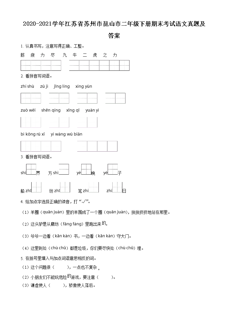 【文档预览】 文档大全网整理发布2020-2021学年江苏省苏州市昆山市二年级下册期末考试语文真题及答案(Word版),前五页预览如下: