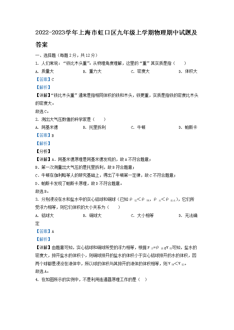 【文档预览】 文档大全网整理发布2022-2023学年上海市虹口区九年级上学期物理期中试题及答案(Word版),前五页预览如下: