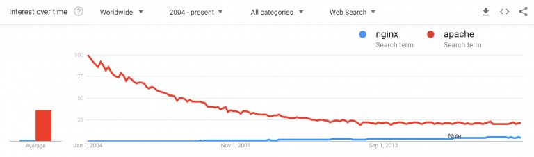 如果我们从2004年开始看看百度搜索术语,我们可以看到Apache一直在稳步下滑,而NGINX则略有增长。