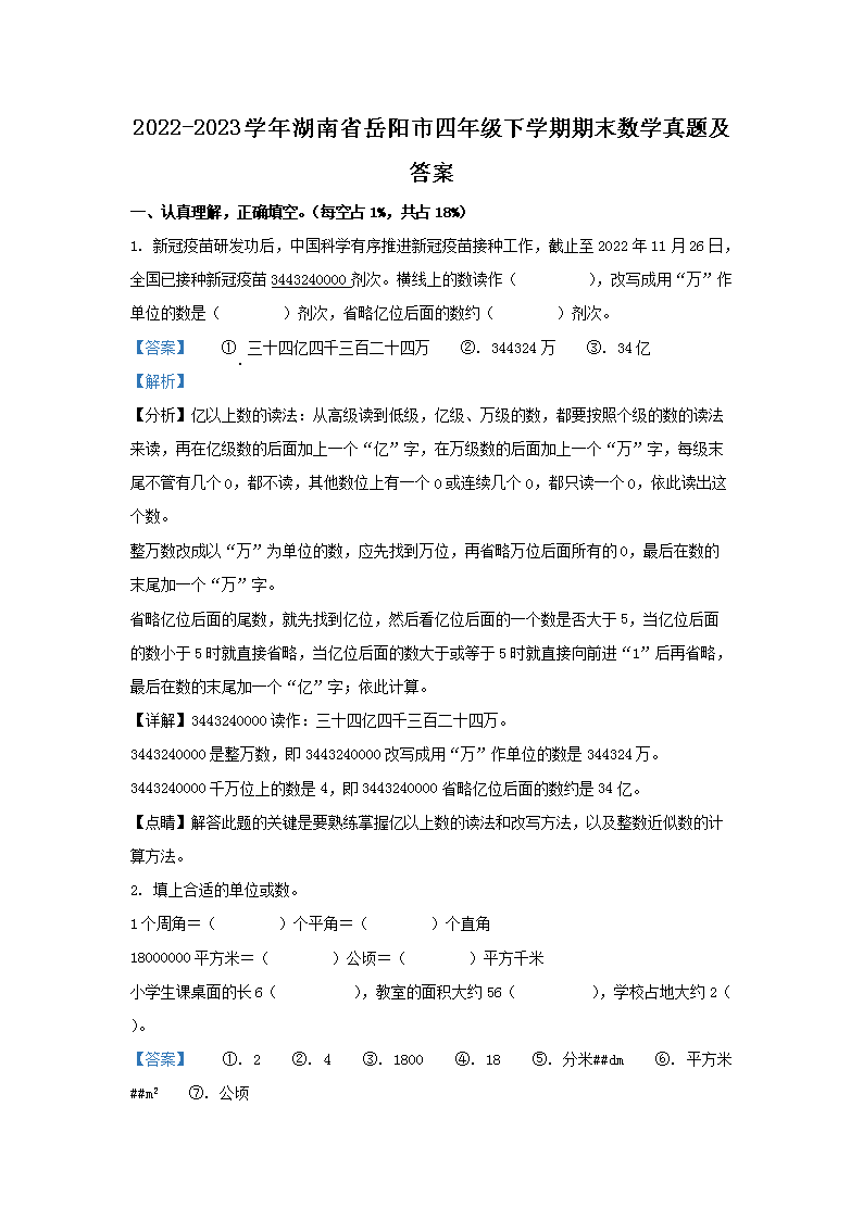 2022-2023学年湖南省岳阳市四年级下学期期末数学真题及答案(Word版)10-14