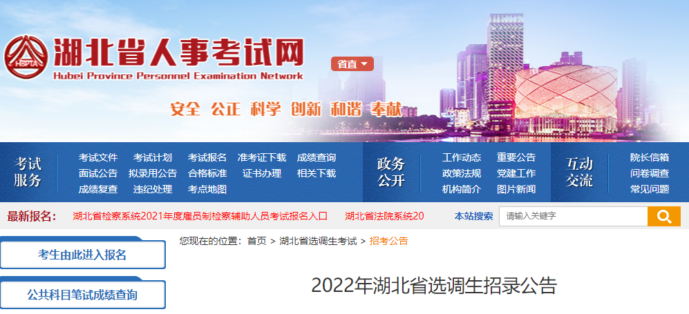 省委组织部、省委编办、省教育厅等部门联合下发文件,并在湖北省人事考试网(www.hbsrsksy.cn)等相关网站上发布《2022年湖北省选调生招录公告》。