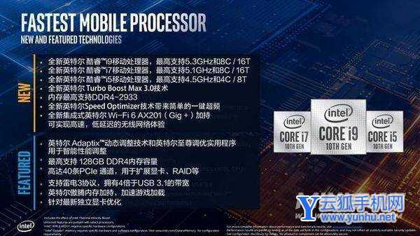 在 10 代酷睿移动版处理器系列上,除了我们熟知的睿频加速 2.0 技术,英特尔还在 10 代酷睿中支持睿频加速 MAX 3.0 技术以及 Thermal Velocity Boost 加速技术,这些技术将整个 i7 系列和 i9 系列的睿频水平线提高到了 5.0GHz 的水平上,并且在 i7 系列上第一次采用了 8 核 16 线程的设计,相较于三年前的笔记本,可以在游戏帧率上实现 44% 的性能提升。