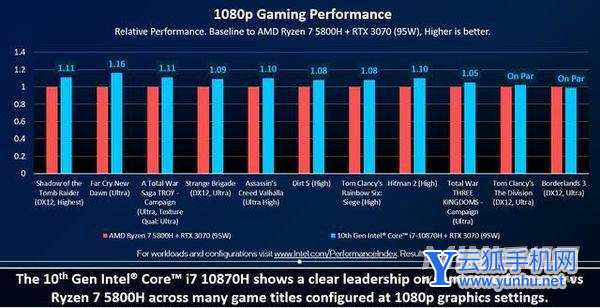 通过多款游戏测试的对比数据我们看到,在 11 款热门的 3A 大作中,英特尔酷睿 i7-10870H 在其中的 9 款表现超过 AMD 锐龙 7 5800H,另有 2 款游戏表现而这不相上下。在测试的 11 款游戏中,英特尔酷睿 i7-10870H 在《孤岛惊魂:新曙光》极高画面表现下,帧率领先 AMD 锐龙 7 5800H 达到 16%,其他游戏基本上也有 5%-10% 的领先优势。
