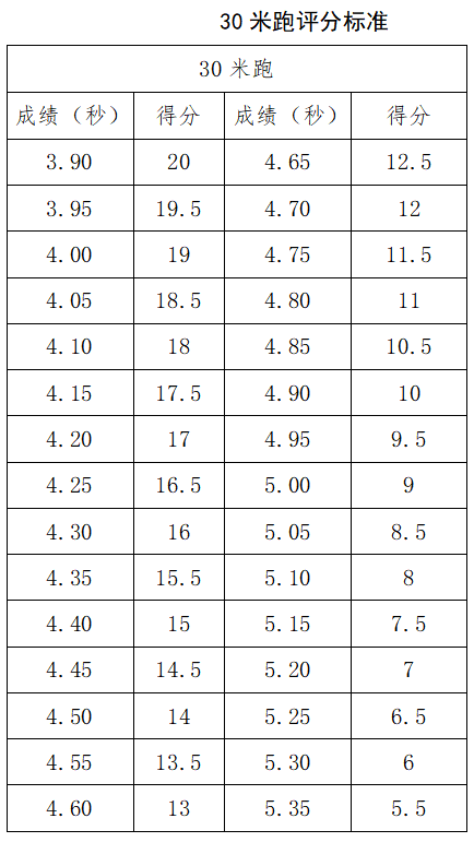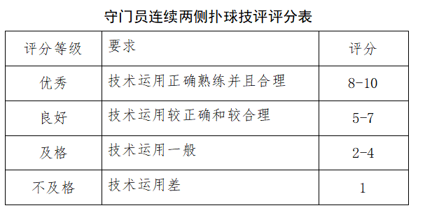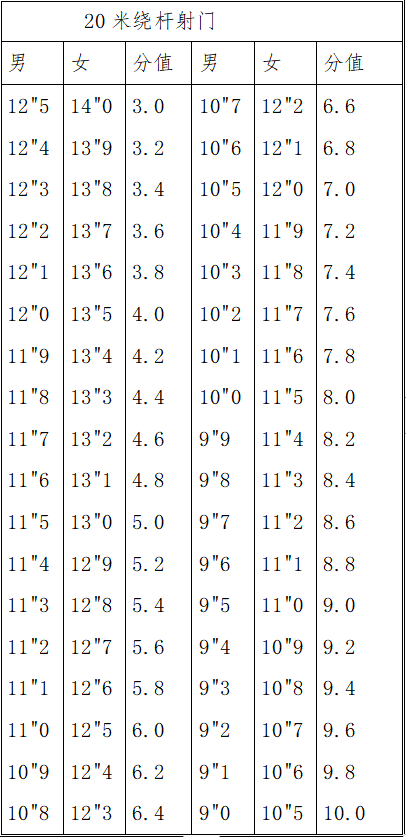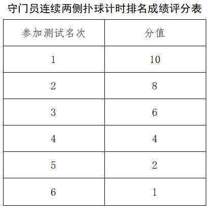②守门员免试20米运球过杆射门和定位球传准;守门员加试连续两侧扑球,满分20分(其中技评10分,计时排名10分)。