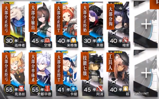 需求干员:单狙*2、群狙*1、单体术士*1、重装*2、单奶*1、钩*1、推*1(技能7级)、工具人