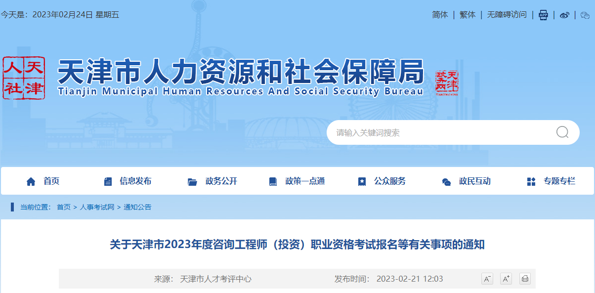 【#咨询师考试# 导语】©文档大全网从天津市人力资源和社会保障局获悉,《2023年天津咨询工程师(投资)职业资格考试报名通知》现已公布,报名时间:2月22日-28日,考试时间:4月8日-9日,更多事宜请参考阅读《考务通知》,官方公告原文如下: