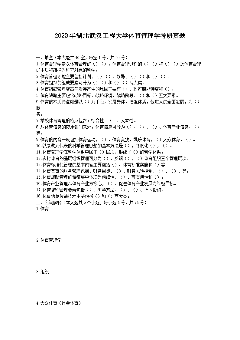 2023年湖北武汉工程大学体育管理学考研真题(Word版)10-19