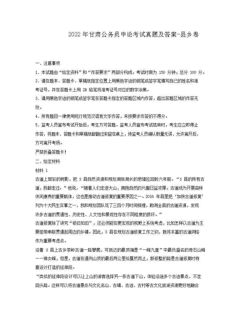 2022年甘肃公务员申论考试真题及答案-县乡卷(Word版)06-29