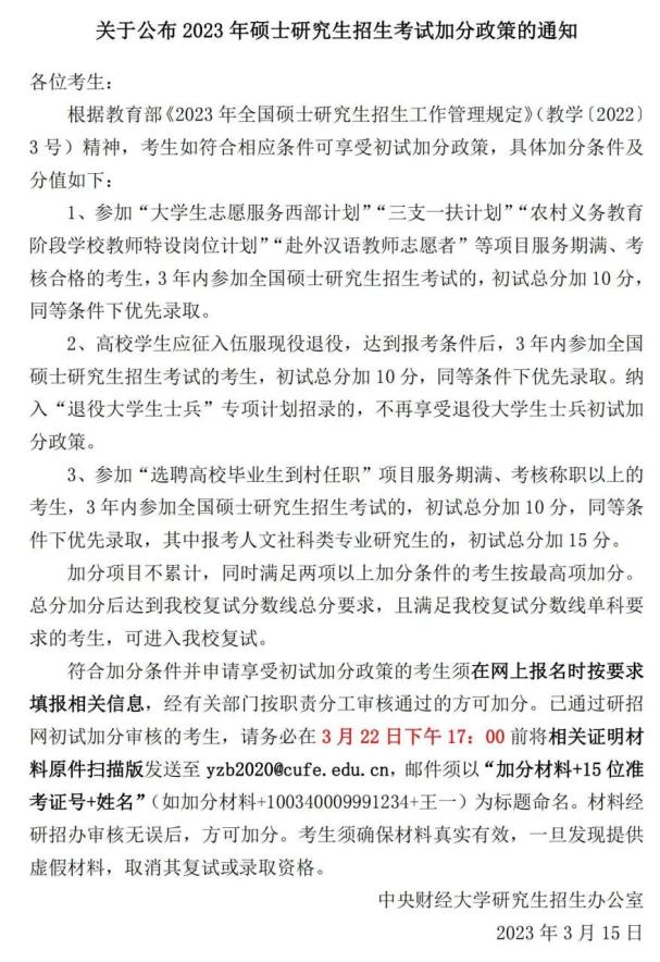 2023年硕士研究生招生考试加分政策: