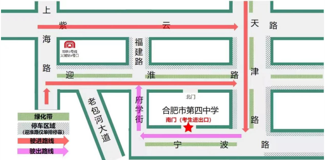 1.合肥四中位于包河区宁波路224号。如您乘坐公交68路来校,从合肥四中新区站下车、步行约2分钟,经由学校北门(迎淮路)入校;如您乘坐地铁五号线来校,可从义城站4号口出站、步行约10分钟,经由学校北门(迎淮路)入校;如您自驾来校,请您将车辆停放在校园周边生态停车位,经由学校南门(宁波路)、北门(迎淮路)入校。