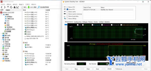 我们现在就进入烤机环节测试一下。首先是单烤 CPU,我们用 AIDA64 单烤 FPU 进行烤机。在 15Min 的单烤 FPU 后,