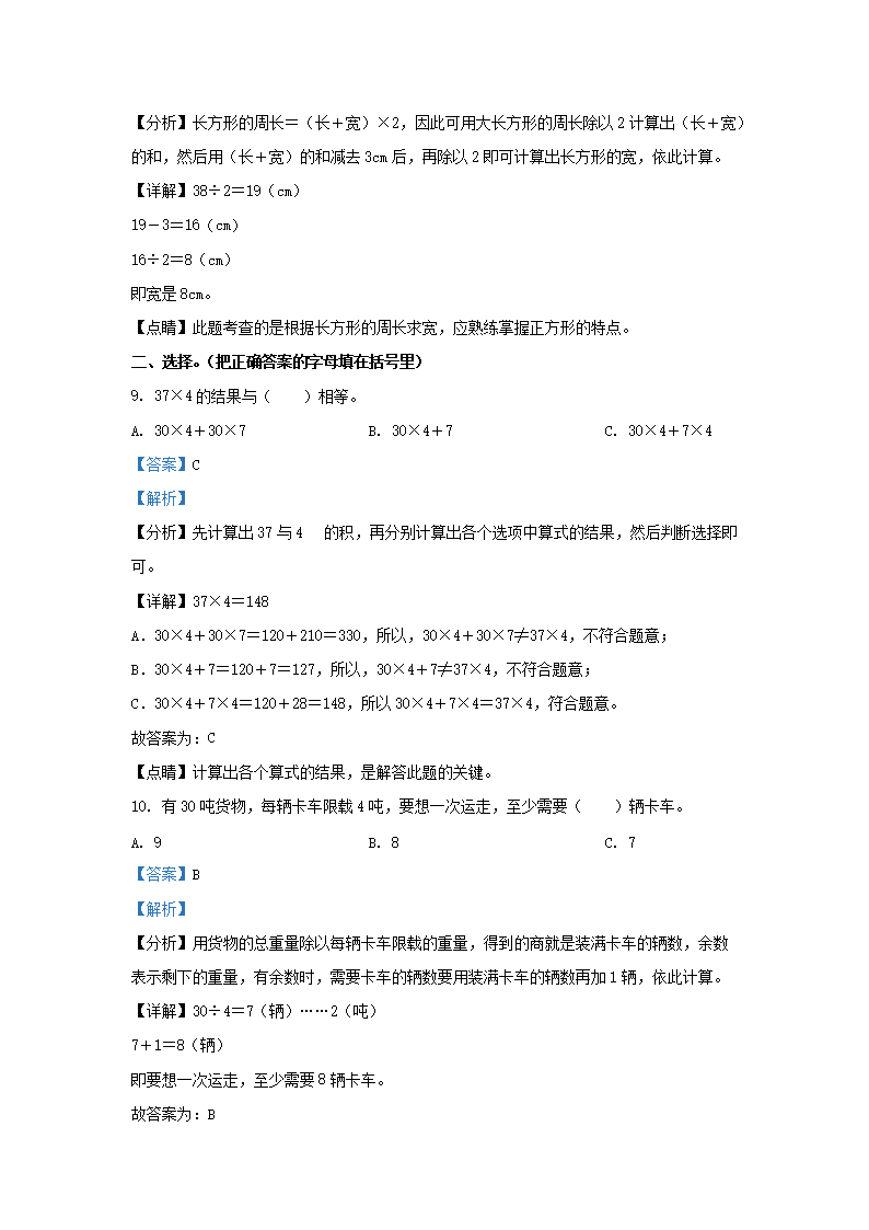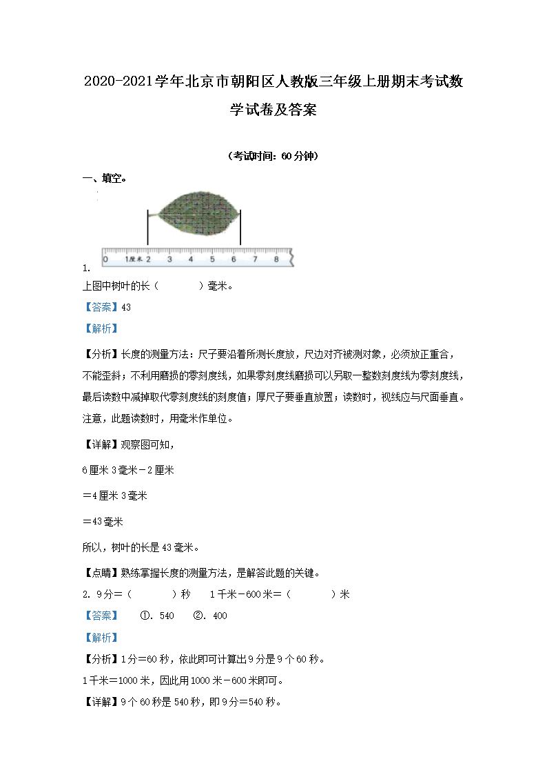 2020-2021学年北京市朝阳区人教版三年级上册期末考试数学试卷及答案(Word版)06-27