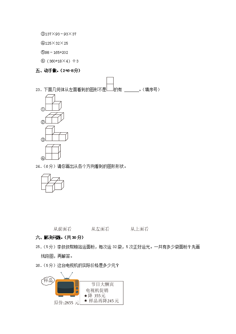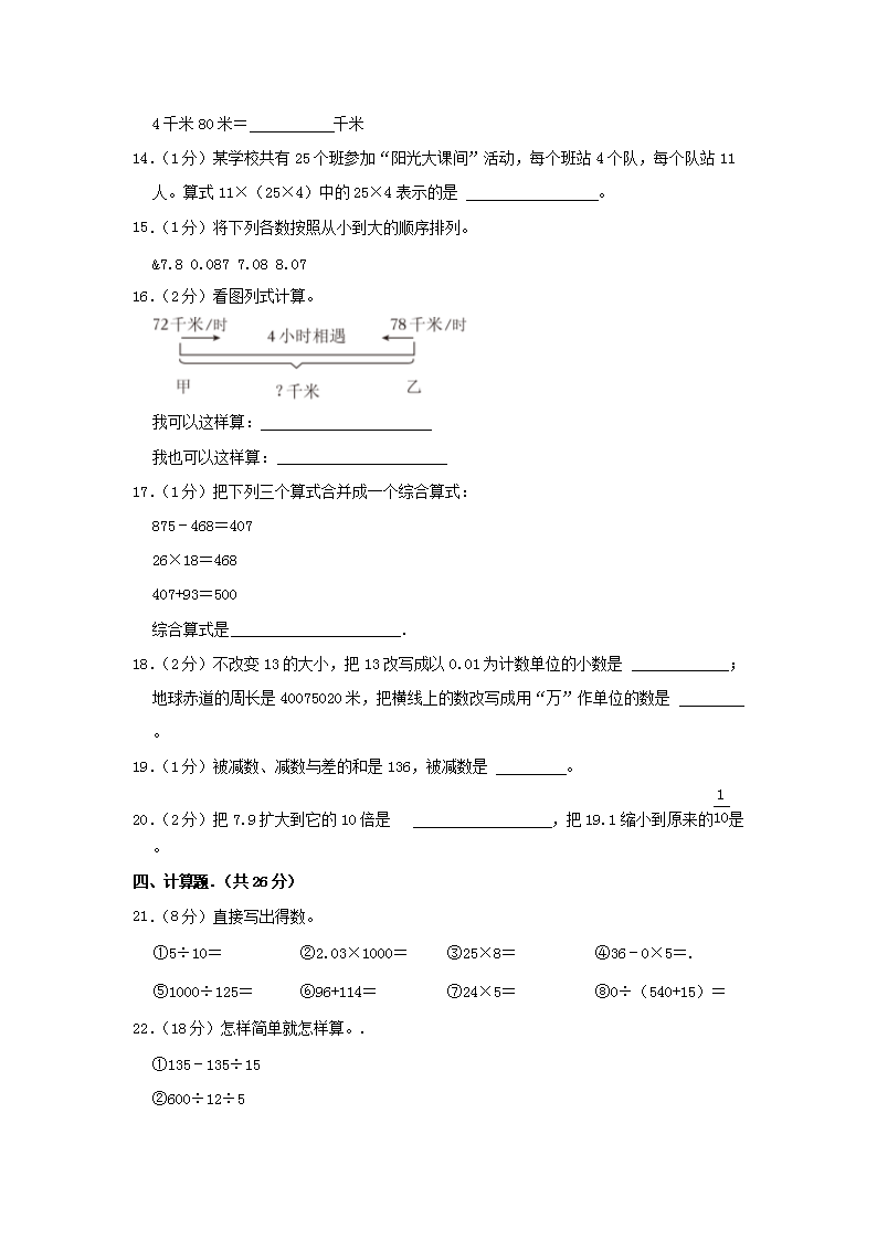 2022-2023学年广东省珠海市斗门区四年级下学期期中数学真题及答案(Word版)10-21