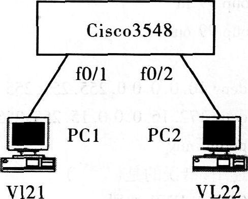 32、 如下图所示,在一台Cisco Catalyst 3500交换机上连接2台PC机,使用端口划分方法将它们分别划分在VLAN ID为21、22,VLAN名为VL21、VL22的VLAN中,下列关于交换机VLAN的配置,正确的是( )。