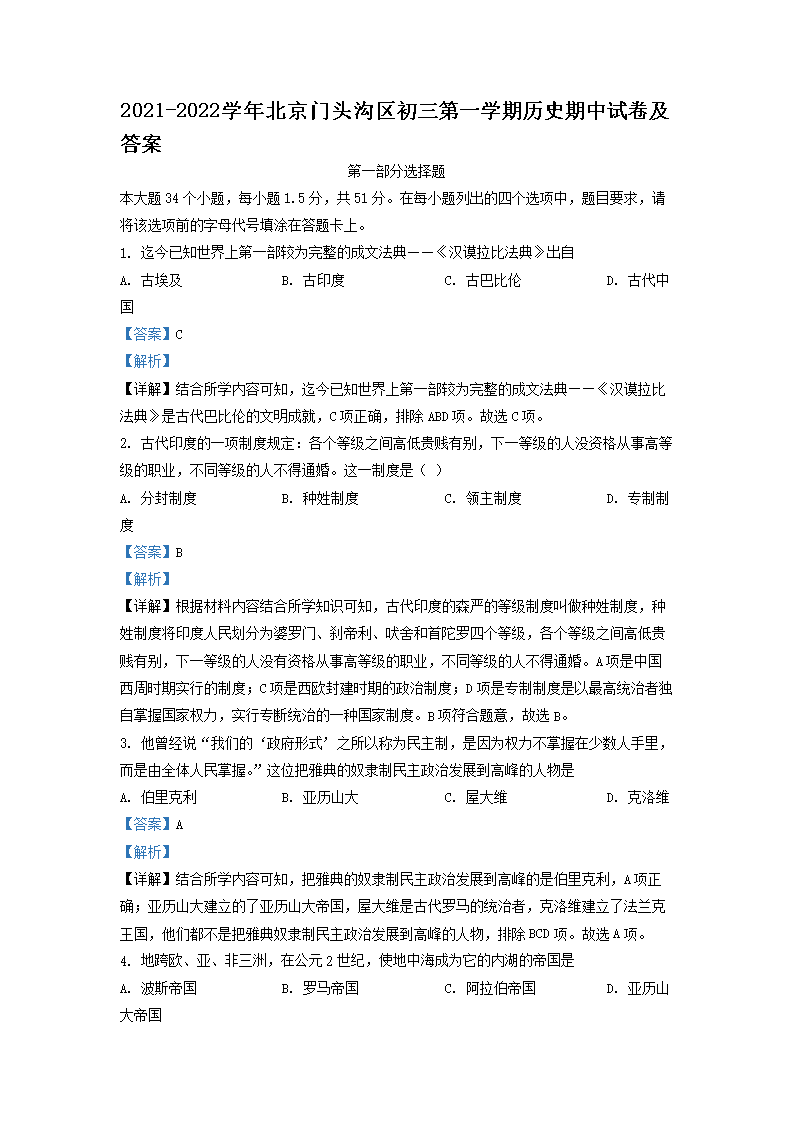 2021-2022学年北京门头沟区初三第一学期历史期中试卷及答案(Word版)06-26