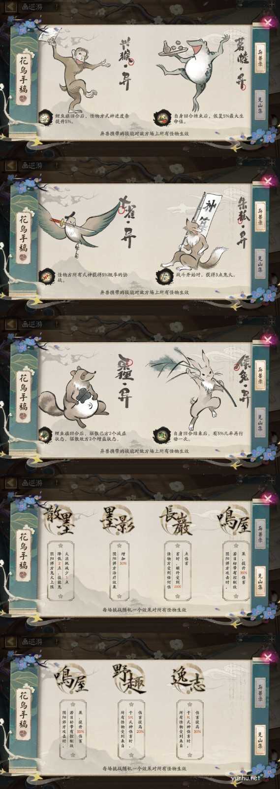 挑战前大人从系统提供的式神中进行选择,共5轮,每轮4个式神。「画灵」携带不同的技能,「画灵」技能对随「画灵」上阵的式神生效,可前往「花鸟手稿」-「异兽录」查看。