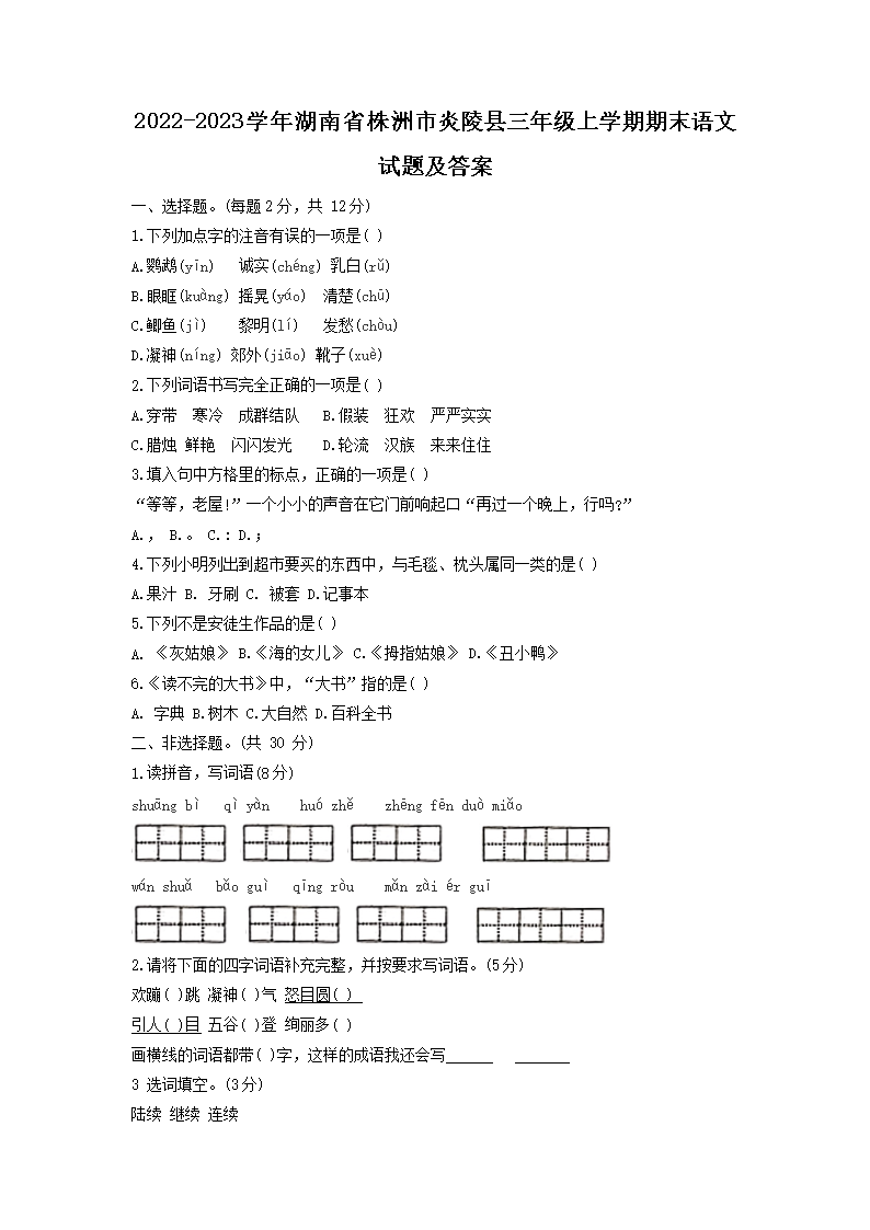 【文档预览】 文档大全网整理发布2022-2023学年湖南省株洲市炎陵县三年级上学期期末语文试题及答案(Word版),前五页预览如下: