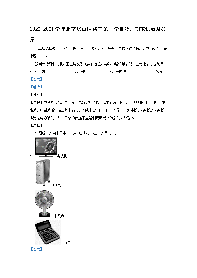 2020-2021学年北京房山区初三第一学期物理期末试卷及答案(Word版)08-11