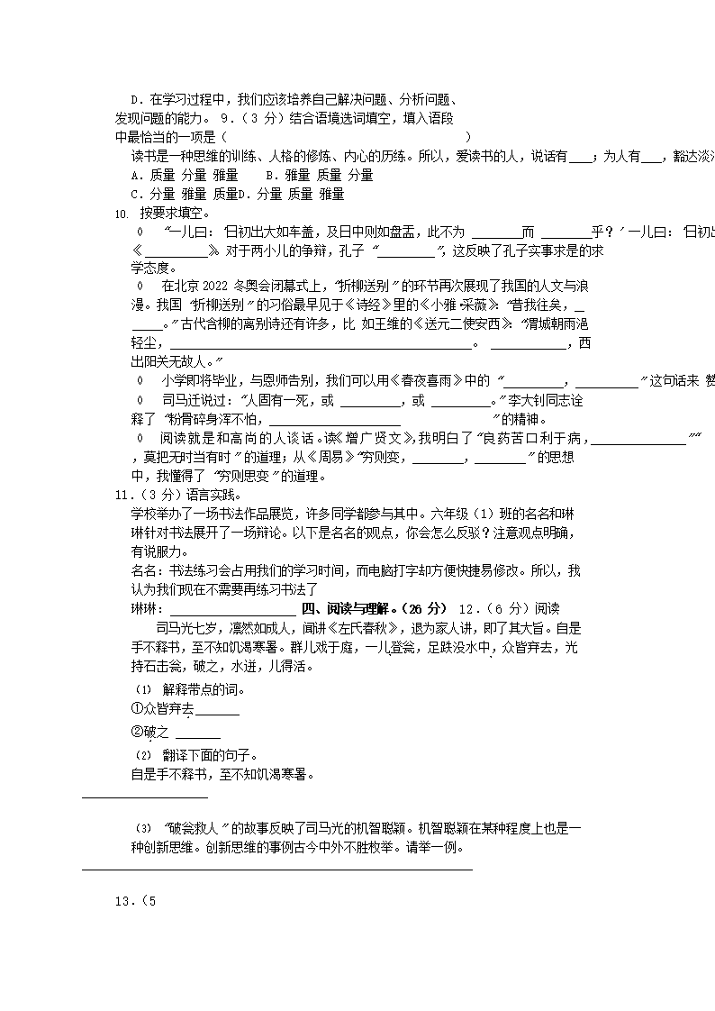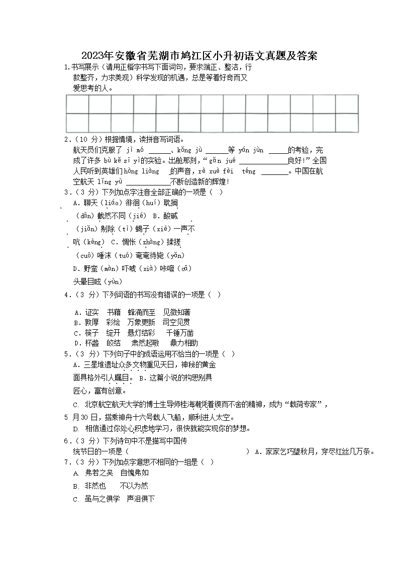 2023年安徽省芜湖市鸠江区小升初语文真题及答案(Word版)09-22