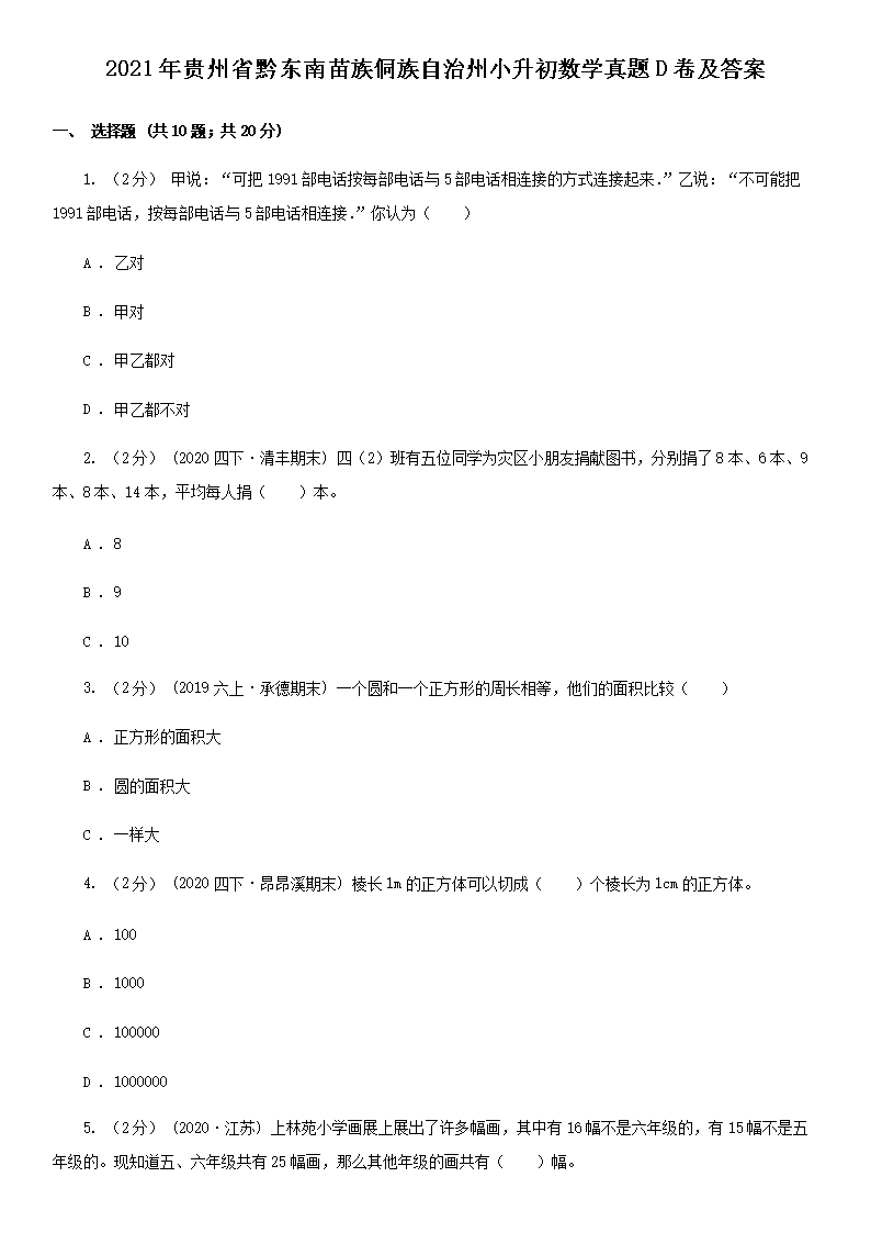 2021年贵州省黔东南苗族侗族自治州小升初数学真题D卷及答案(Word版)08-01
