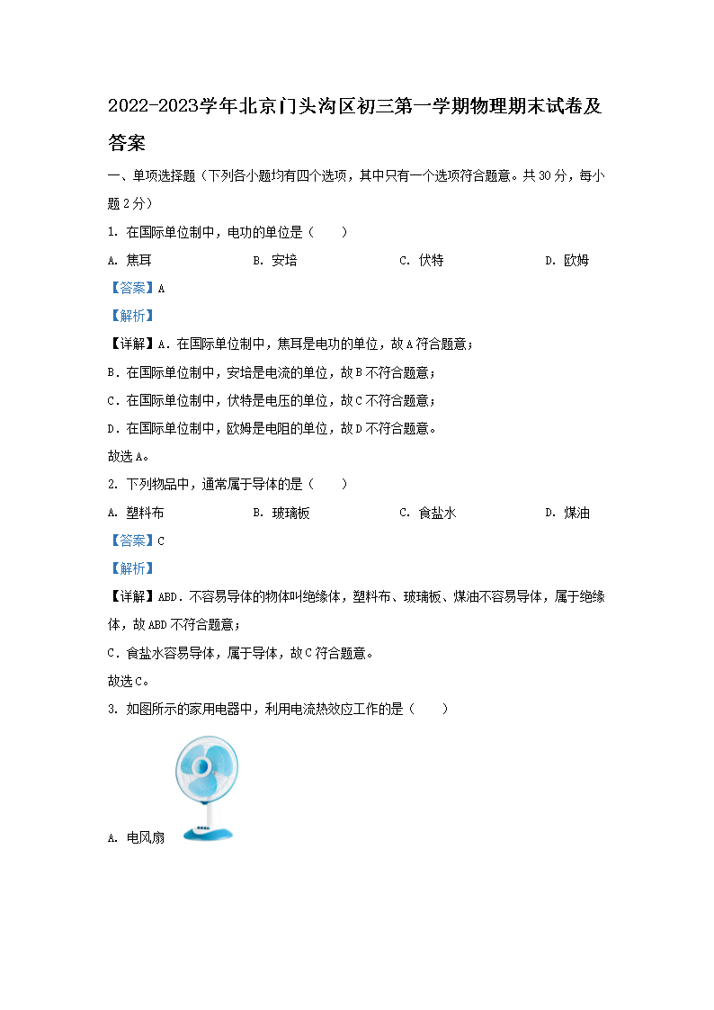 2022-2023学年北京门头沟区初三第一学期物理期末试卷及答案(Word版)08-05