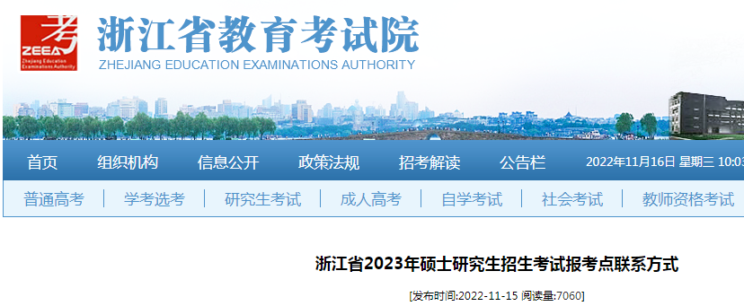 考研频道从浙江省教育考试院了解到,浙江省2023年硕士研究生招生考试报考点联系方式已公布,相关硕士研究生考生可以登录浙江省教育考试院(https://www.zjzs.net/moban/index/index.html)“最新消息”栏目进行查看。