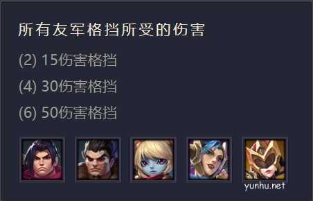 当同时拥有二个骑士、四个骑士、六个骑士的时候羁绊效果分别为:所有友军格挡减少15点伤害、格挡减少30点伤害、格挡减少50点伤害。(如下图所示)