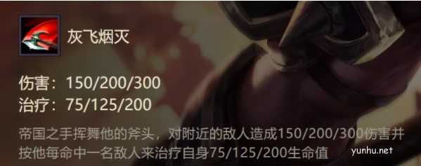 4、技能效果:帝国之手朝目标挥舞他的斧头,1星时、2星时、3星时沿直线对两名敌人分别造成150、200、300伤害并且回复自身生命值75/125/200。(如下图所示)