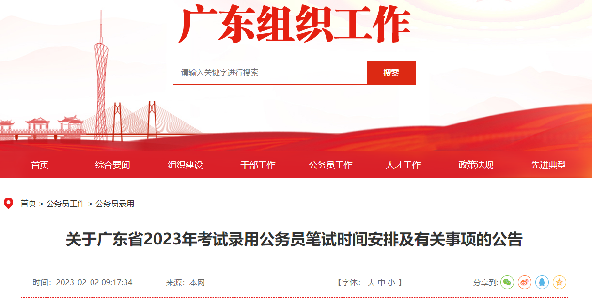 广东省2023年考试录用公务员笔试定于2023年2月25日举行。现将有关事项公告如下: