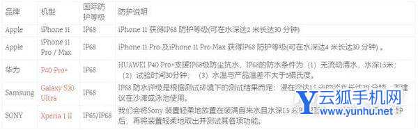 由上图可见,虽然大家的防护等级相同,但是Samsung、华为和SONY 只是放罝在1.5 米的水上,而iPhone 11 Pro / Max 则达4 米,可见防水标准一样,但手机的防水性能未必一样。加上只有Xperia 1 II 是同时具备IP65 和IP68 的防喷水及防浸水等级,所以防水等级也不是数字越大就越好。