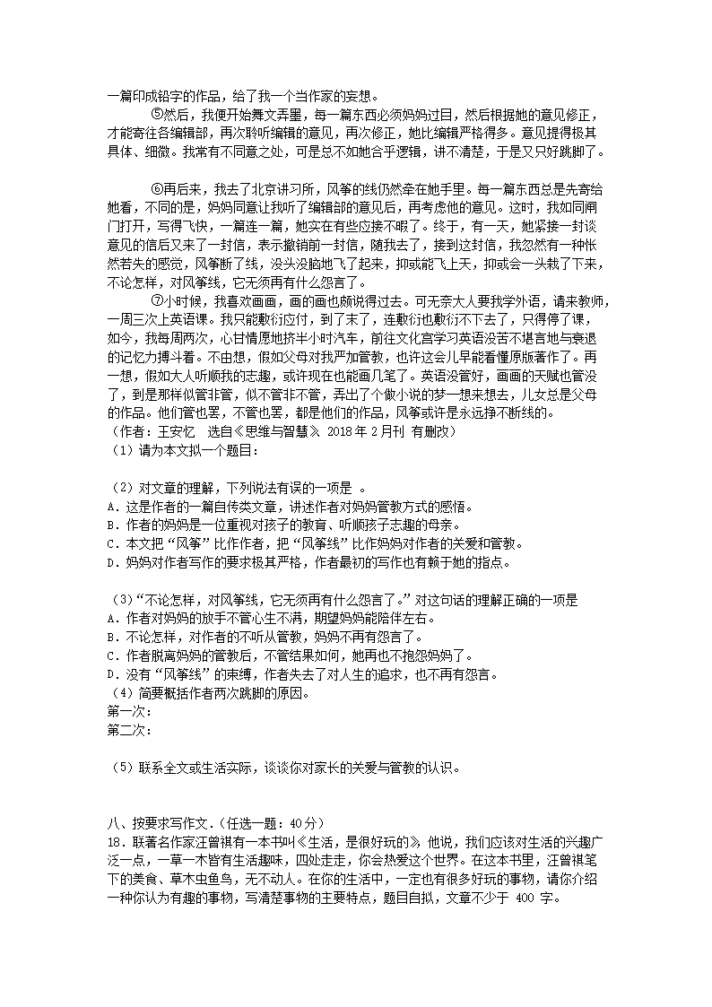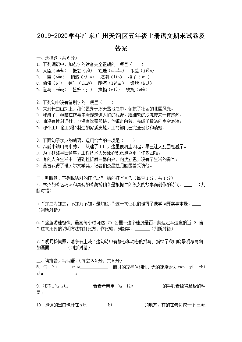 2019-2020学年广东广州天河区五年级上册语文期末试卷及答案(Word版)08-01