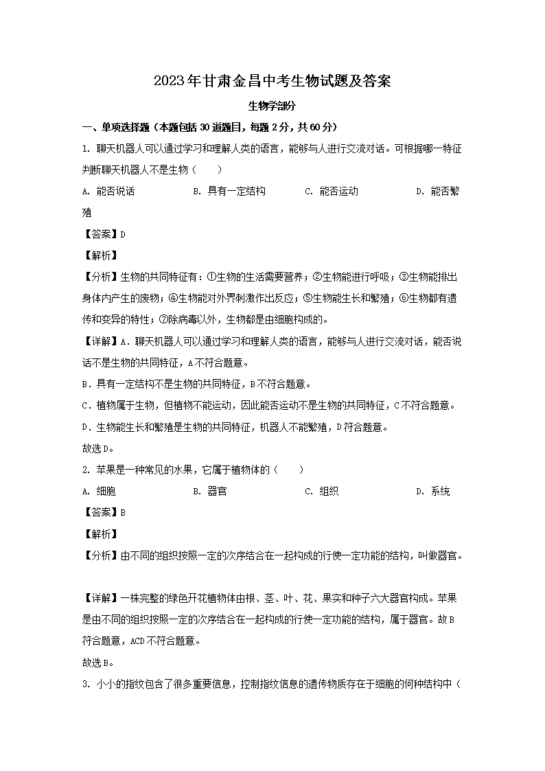 【文档预览】 文档大全网整理发布2023年甘肃金昌中考生物试题及答案(Word版),前五页预览如下: