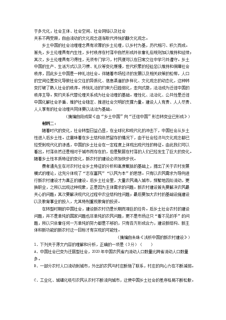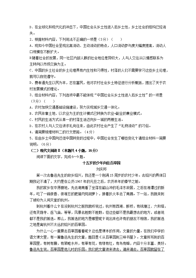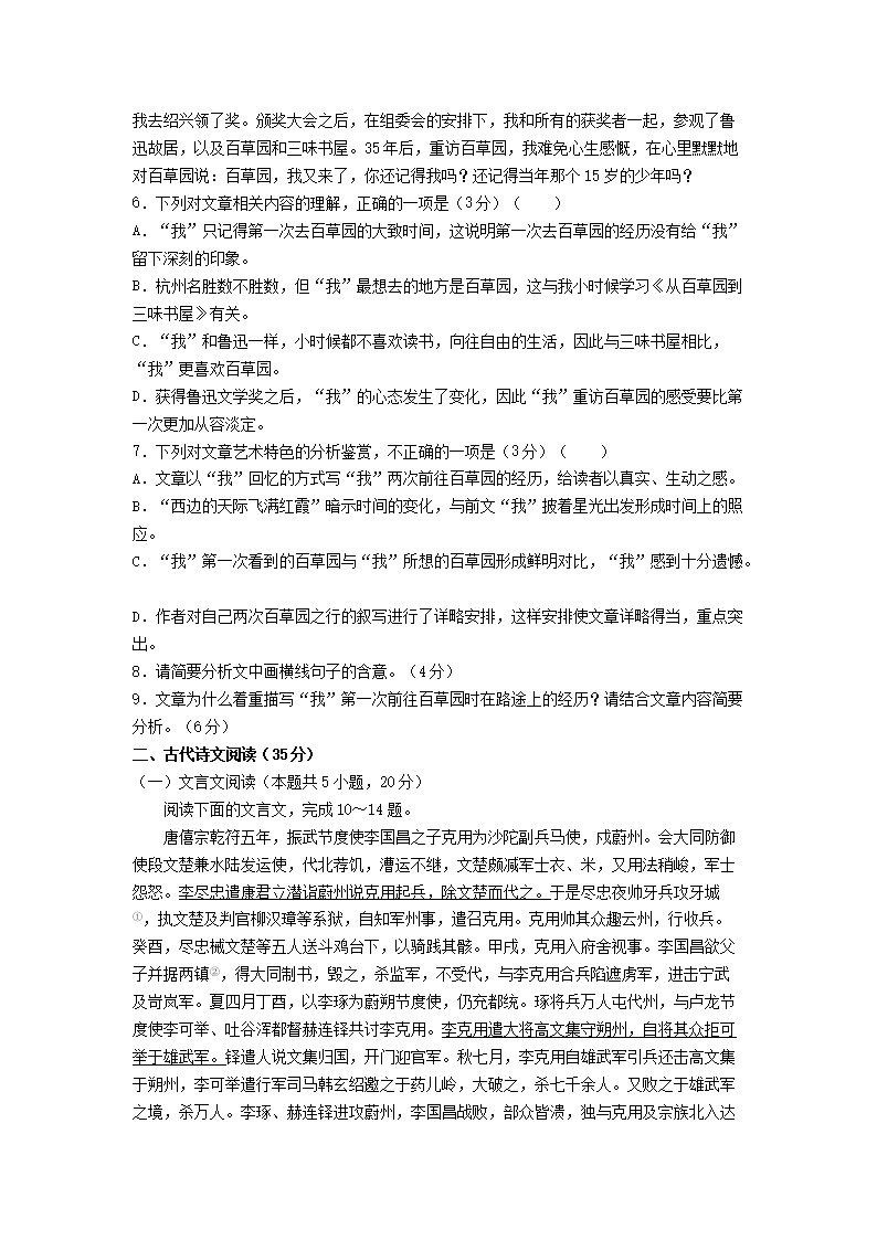 2021-2022年河北张家口高一语文上学期期末试卷及答案(Word版)08-31