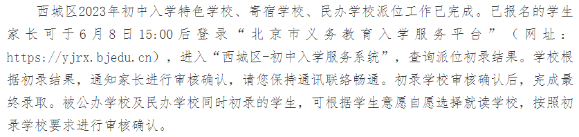 北京西城区2023年初中入学特色学校、寄宿学校、民办学校派位结果查询入口(已开通)06-13