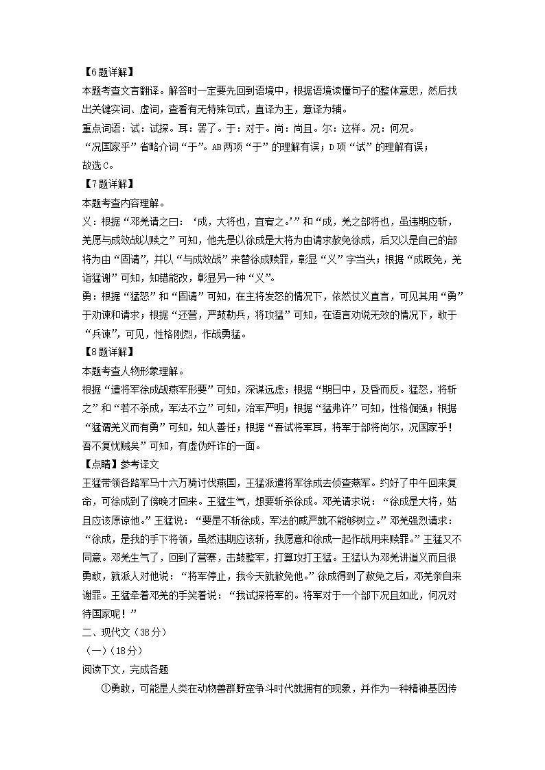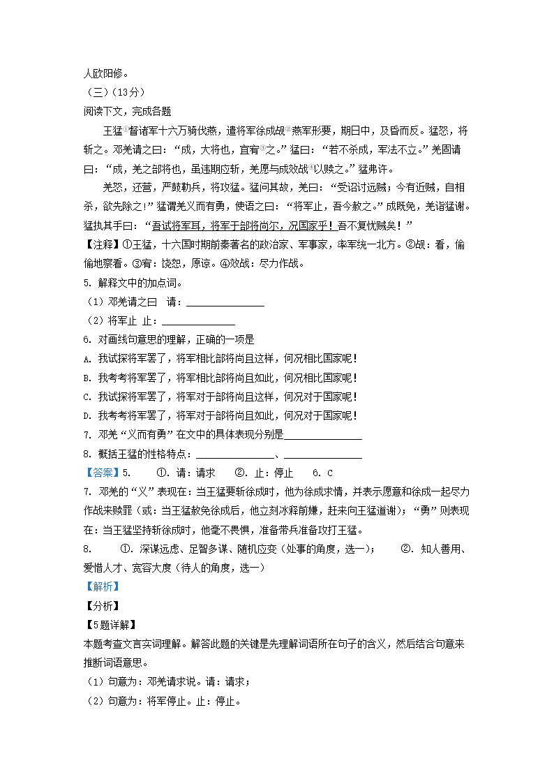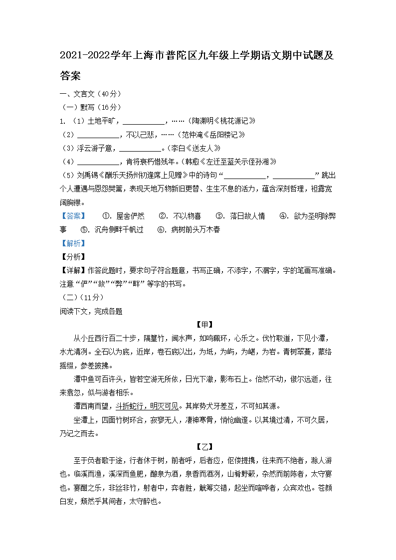2021-2022学年上海市普陀区九年级上学期语文期中试题及答案(Word版)10-19