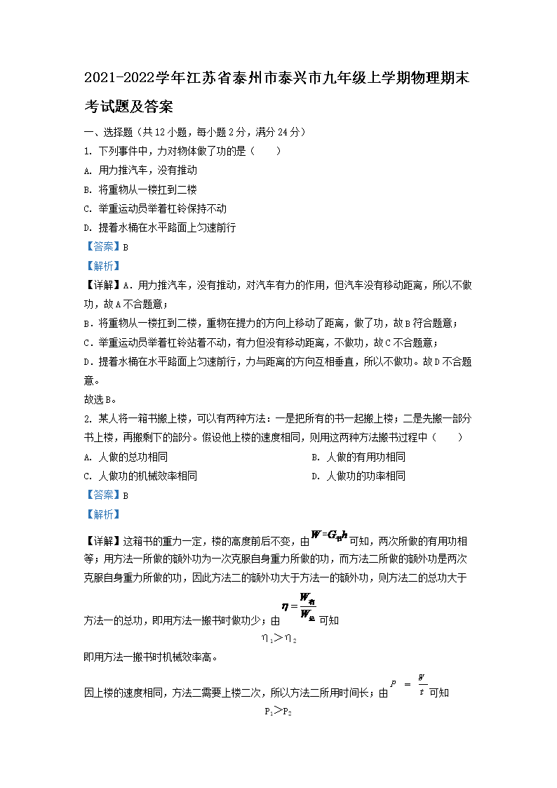 【文档预览】 文档大全网整理发布2021-2022学年江苏省泰州市泰兴市九年级上学期物理期末考试题及答案(Word版),前五页预览如下: