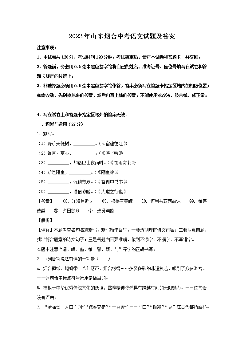 2023年山东烟台中考语文试题及答案(Word版)06-26