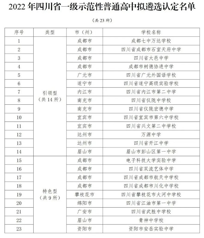 其中,2022年四川省一级示范性普通高中拟遴选认定名单全省共23所,成都有8所,分别是: