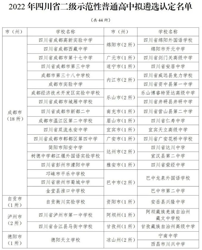 2022年四川省二级示范性普通高中拟遴选认定名单共有44所,成都有18所。