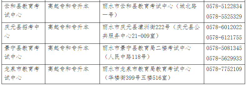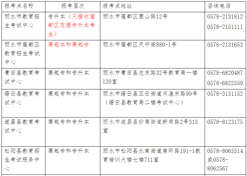 特别提醒:全市高起本考生报考点选择丽水市莲都区教育招生考试中心(全市高起本仅设丽水市莲都区教育招生考试中心报考点)。国家承认学历的各类高、中等学校在校生不得报考,请考生根据自身情况选择相应报考点。