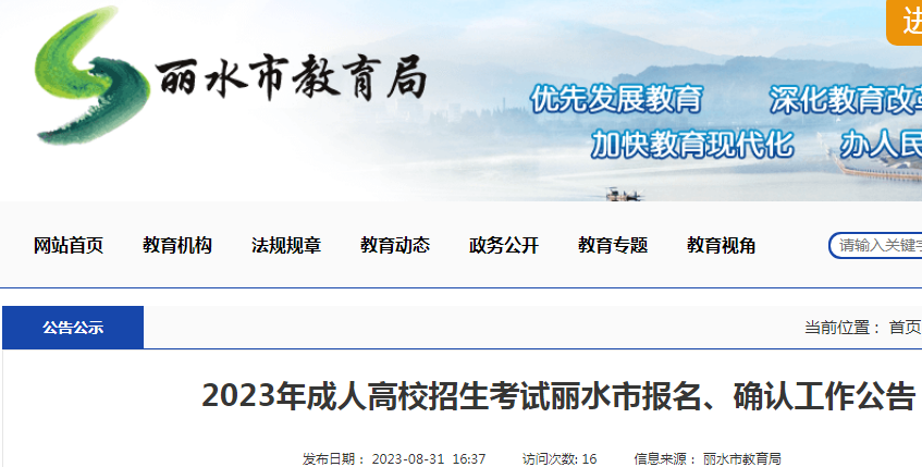 2023年成人高校招生考试将于10月21日至10月22日举行,我市共设10个报名点。考生报考前请先仔细阅读《2023年浙江省成人高校招生工作实施方案》(见附件)。现将丽水市2023年成人高考报名及确认工作有关事项公告如下。