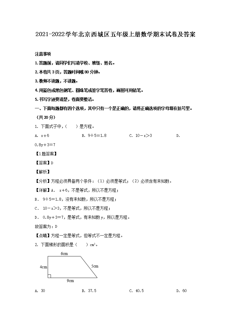 【文档预览】 文档大全网整理发布2021-2022学年北京西城区五年级上册数学期末试卷及答案(Word版),前五页预览如下: