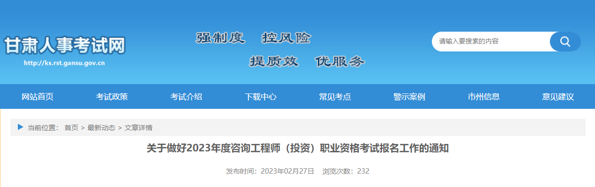 【#咨询师考试# 导语】©文档大全网从甘肃人事考试网获悉,《2023年甘肃咨询工程师(投资)职业资格考试报名通知》现已公布,报名时间:2月28日-3月7日,考试时间:4月8日-9日,更多事宜请参考阅读《考务通知》,官方公告原文如下: